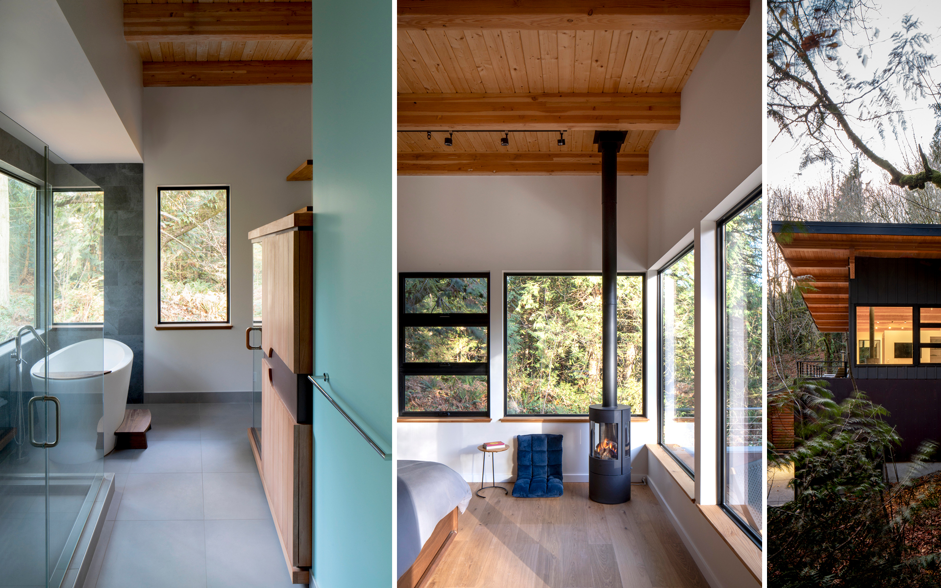 On this rural site, set against Washington State’s Tiger Mountain Natural Forest, our team collaborated closely with our client in adding a utility garage, sauna, and bedroom suite to a single-story log cabin. Positioning the addition back from the existing façade enhanced the cabin’s presence and minimized the addition’s scale, while Corten steel paneling and exposed wood structure brought a cohesive aesthetic. Elevating the sleeping space provided access to daylight and treehouse-like views. Existing and new hinge on a two-story stair connector, constructed by the owner with wood harvested from a site-fallen tree.